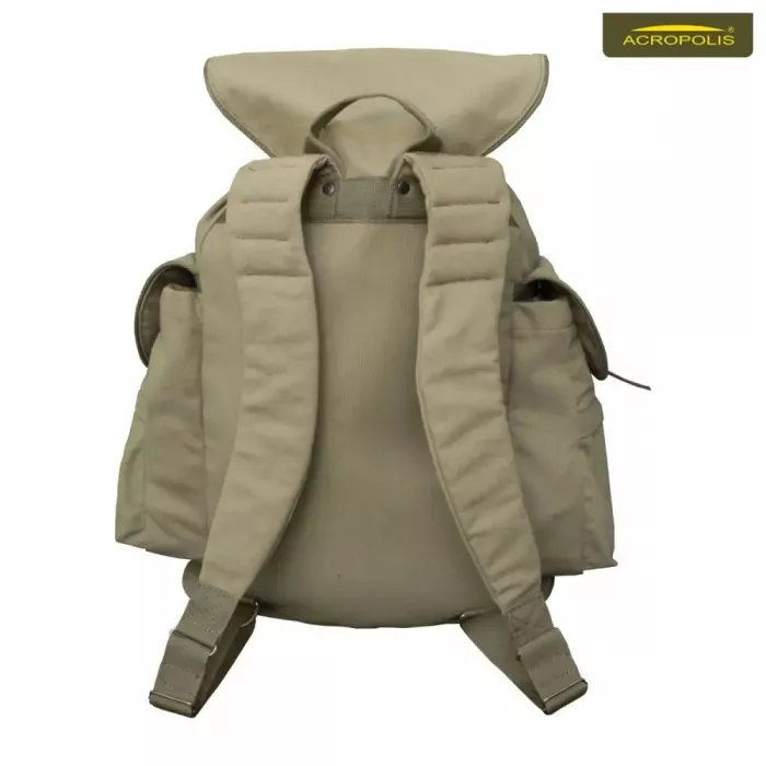 Окрім передньої допоміжної кишені, в Акрополіс РМ-2 є ще два бічних відділи зі своїми кишеньками. Центральне відділення достатньо велике. Сюди можна скласти сухий пайок та речі. Міцно затягується на шнурок з фіксатором та зверху покривається клапаном. З внутрішньої сторони клапана пришита невеличка кишенька на замочку для дрібничок. І основне відділення, і допоміжні рюкзака Акрополіс закриваються на металеві застібки з спеціальними хлястиками, які зроблені з натуральної шкіри. Рюкзак зроблений з вологостійкого брезенту, який добре експлуатується та витримує тривалі навантаження. Зі сторони спини надійно пришиті зручні лямки для переносу виробу на плечах. В місцях їх кріплення до основної конструкції рюкзака вони укріплені вставками зі шкіри та металевими хольнітенами.