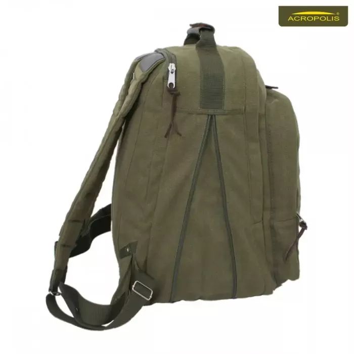 Брезентовий рюкзак для мисливців Акрополіс РМ-5. Основне відділення призначене для транспортування габаритного мисливського спорядження. В разі потреби збільшується в об'ємі. Для цього в конструкції виробу передбачений замок-блискавка, який мисливець може розстебнути і вивільнити сховану частину відділення.