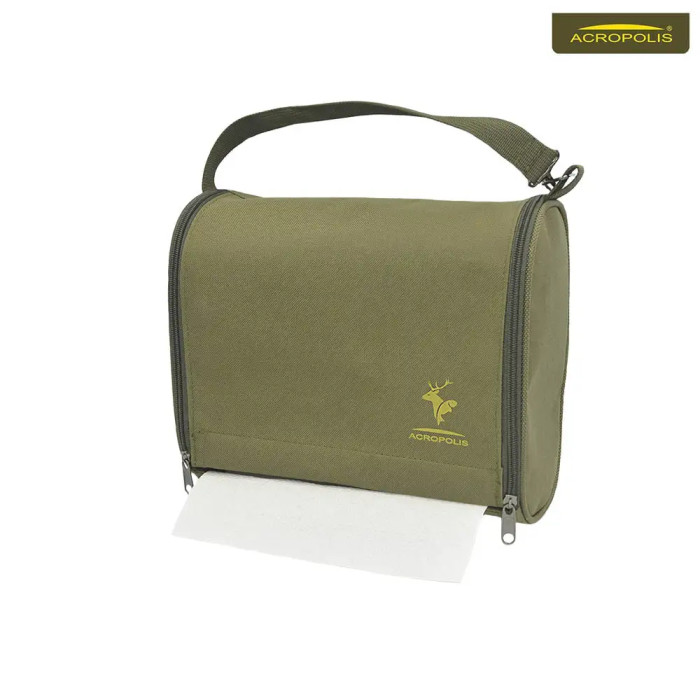 Сумка гігієнічна для двох рулонів паперових рушників, розроблена компанією "Акрополіс" для рибаків, мисливців, енергійних людей, які полюбляють "зелений" туризм. Зносостійкий матеріал добре відштовхує вологу та зберігає рушнички паперові сухими в дощову погоду, туман чи в умовах надмірної сирості. Сумка повністю відкривається за допомогою замків блискавок. Має ремінець для перенесення в руках. З однієї сторони ремня пришитий відчепний металевий карабін. Сумку можна підвішати за ручку, а можна зачепити за карабін до рюкзака, розвантажувальної системи тощо.