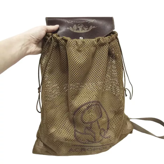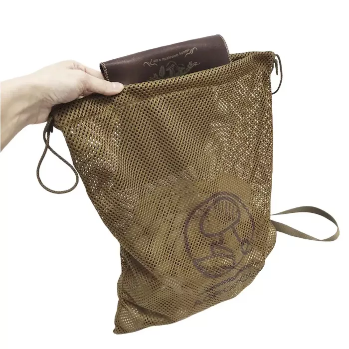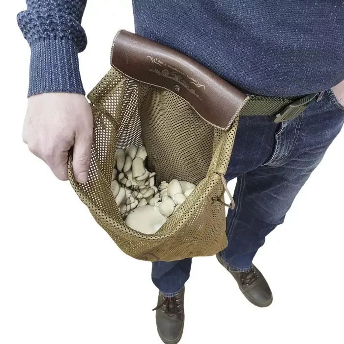 Основа виробу з міцної військової сітки витримує велику вагу. Добре носиться і проста у догляді. Чудово пропускає повітря, залишаючи гриби свіжими протягом тривалого часу. У верхній частині вшитий шнурок, стягнувши який сумка набуде форми мішечка.