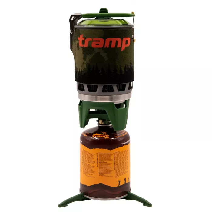 Інтегрована система приготування їжі Tramp TRG-115 складається з казанка на 1 літр в неопреновому чохлі з вбудованим в вітрозахисний екраном ( радіатором - теплообмінником) який підключається до газового пальника, а також підставки під газові балони і таганка для використання іншого посуду в режимі звичайної горілки.