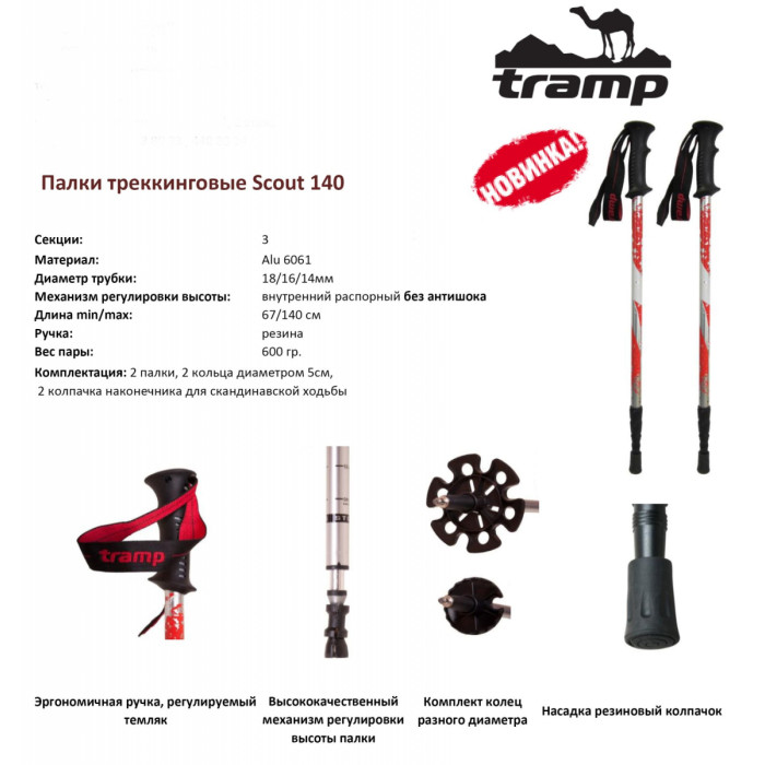 Трекінгові палиці Tramp Scout пара Трекінгові палиці Tramp Scout - прості, надійні, багаторазово випробувані трисекційні телескопічні палиці з класичної внутрішньої цангову системою фіксації секцій. Зручна профилированная рукоятка з морозостійкого пластика з гумовими вставками з регульованим по довжині темляком.