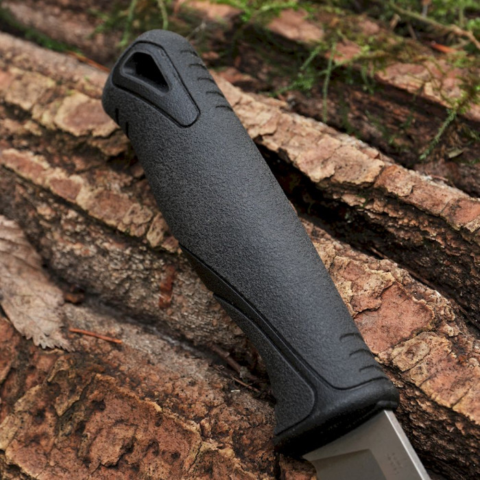 На руківʼї завдовжки 115 мм відсутні гострі краї, запобігаючи натиранню долоні, що особливо важливо під час тривалої та інтенсивної роботи з інструментом. Матеріал руківʼя комбінований: основа виготовлена з поліпропілену (PP) з покриттям із термопластичної гуми (TPR). Це поєднання наділяє руківʼя міцністю та довговічністю, зокрема воно не боїться механічного впливу та зберігає цілісність у разі сильного удару. Нековзна, ребриста поверхня матеріалу зводить до нуля ковзання інструменту у вологій долоні, а дрібні насічки ближче до клинка формують упор під палець.
