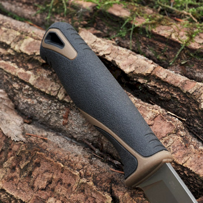На руківʼї завдовжки 115 мм відсутні гострі краї, запобігаючи натиранню долоні, що особливо важливо під час тривалої та інтенсивної роботи з інструментом. Матеріал руківʼя комбінований: основа виготовлена з поліпропілену (PP) з покриттям із термопластичної гуми (TPR). Це поєднання наділяє руківʼя міцністю та довговічністю, зокрема воно не боїться механічного впливу та зберігає цілісність у разі сильного удару. Нековзна, ребриста поверхня матеріалу зводить до нуля ковзання інструменту у вологій долоні, а дрібні насічки ближче до клинка формують упор під палець.