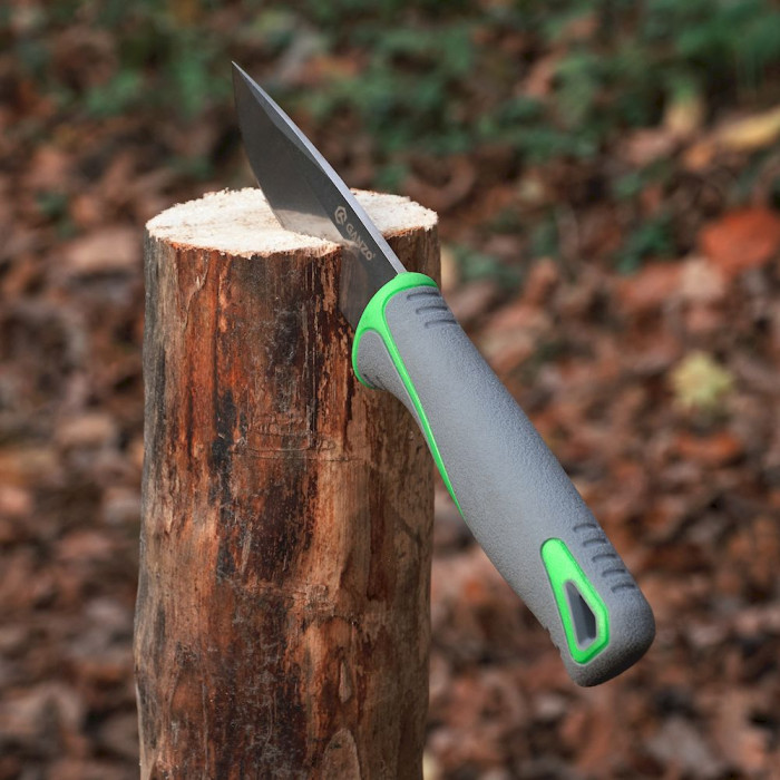 На руківʼї завдовжки 115 мм відсутні гострі краї, запобігаючи натиранню долоні, що особливо важливо під час тривалої та інтенсивної роботи з інструментом. Матеріал руківʼя комбінований: основа виготовлена з поліпропілену (PP) з покриттям із термопластичної гуми (TPR). Це поєднання наділяє руківʼя міцністю та довговічністю, зокрема воно не боїться механічного впливу та зберігає цілісність у разі сильного удару. Нековзна, ребриста поверхня матеріалу зводить до нуля ковзання інструменту у вологій долоні, а дрібні насічки ближче до клинка формують упор під палець.