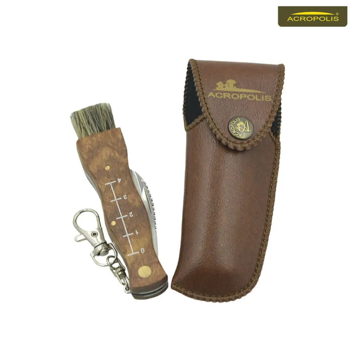 Щоб не загубити ножика в лісі, передбачений карабін, який кріпиться до страхувального шнура. Для очищення грибів від забруднень в торці є щітка з м’якою щетиною. Для вимірювання розміру «трофею» на одному з боків ручки нанесена лінійка. Ножі для грибалки Acropolis мають латунні заклепки.