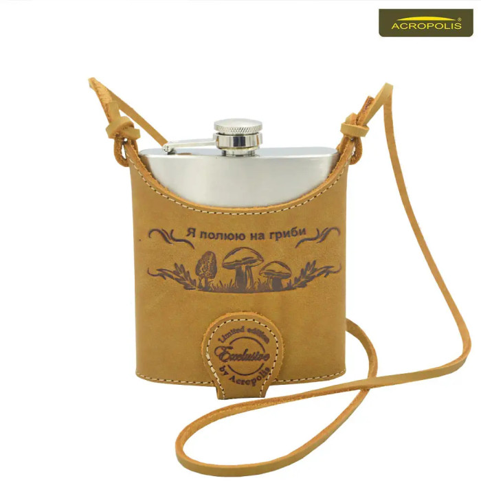 Фляга металева в шкіряному чохлі «Я полюю на гриби» Acropolis ФЛ-1г