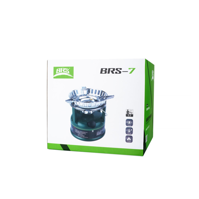 Рідкопаливний пальник BRS-7 для туристичної діяльності, активного відпочинку. Працює на неетильованому бензині (рекомендовано - 95 і вище; допустимо - 92) та дизелі. Потужність досягає 9800 Вт. Витрата палива: 425 грамів на годину. Об'єм паливного бака: 3,5 літра. Матеріалом для виробу стала високотермостійка нержавіюча сталь.